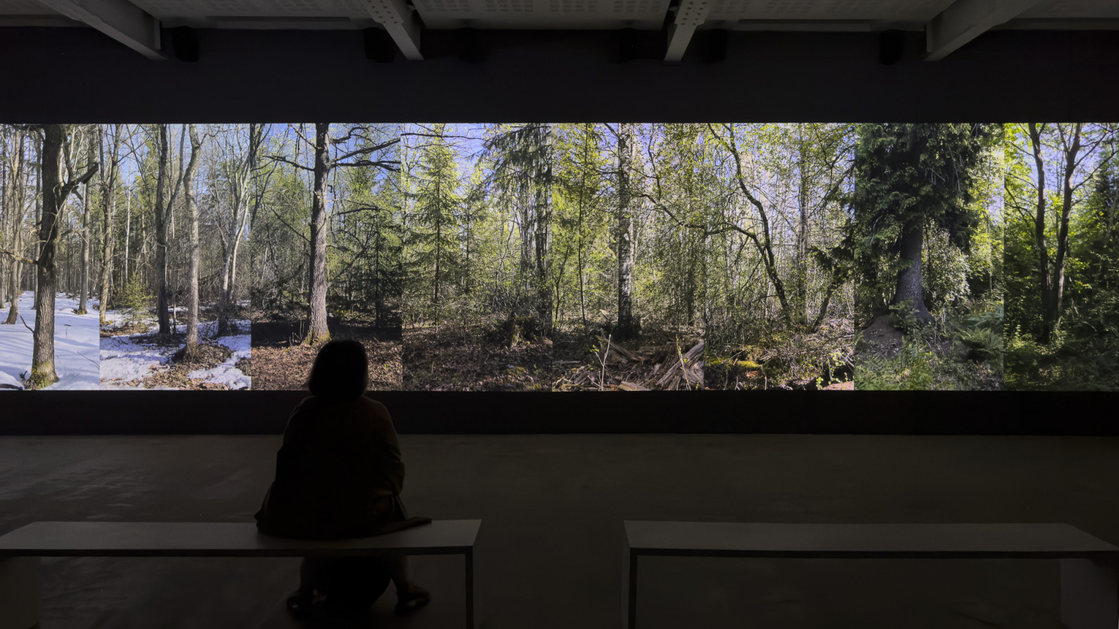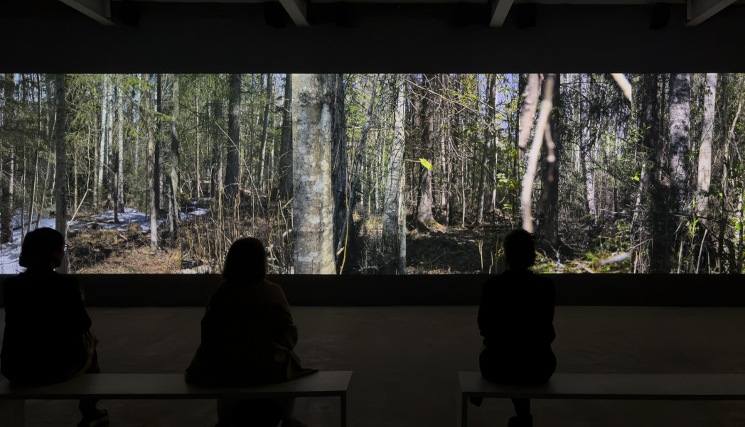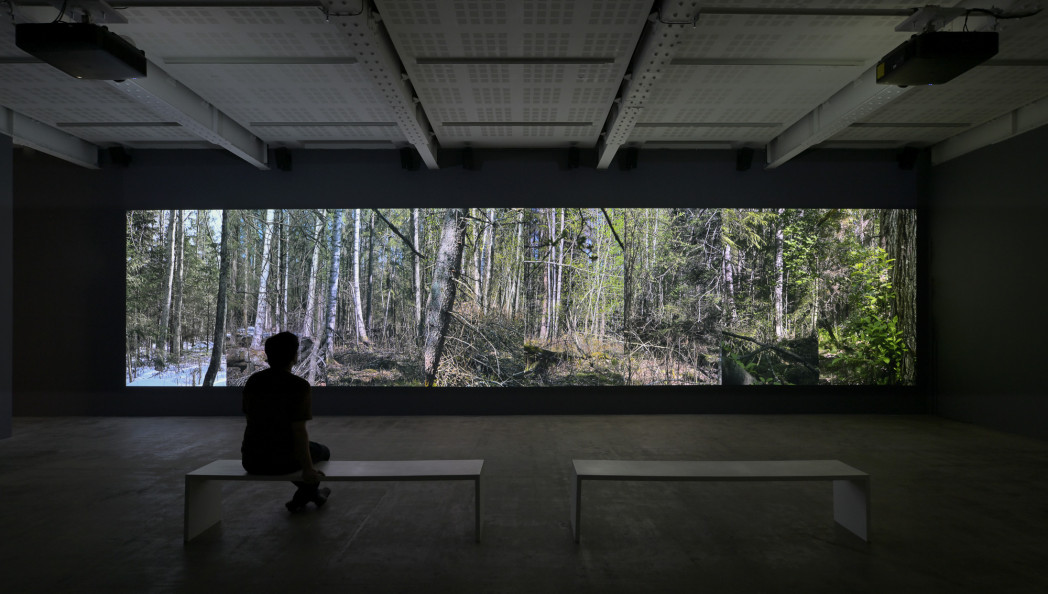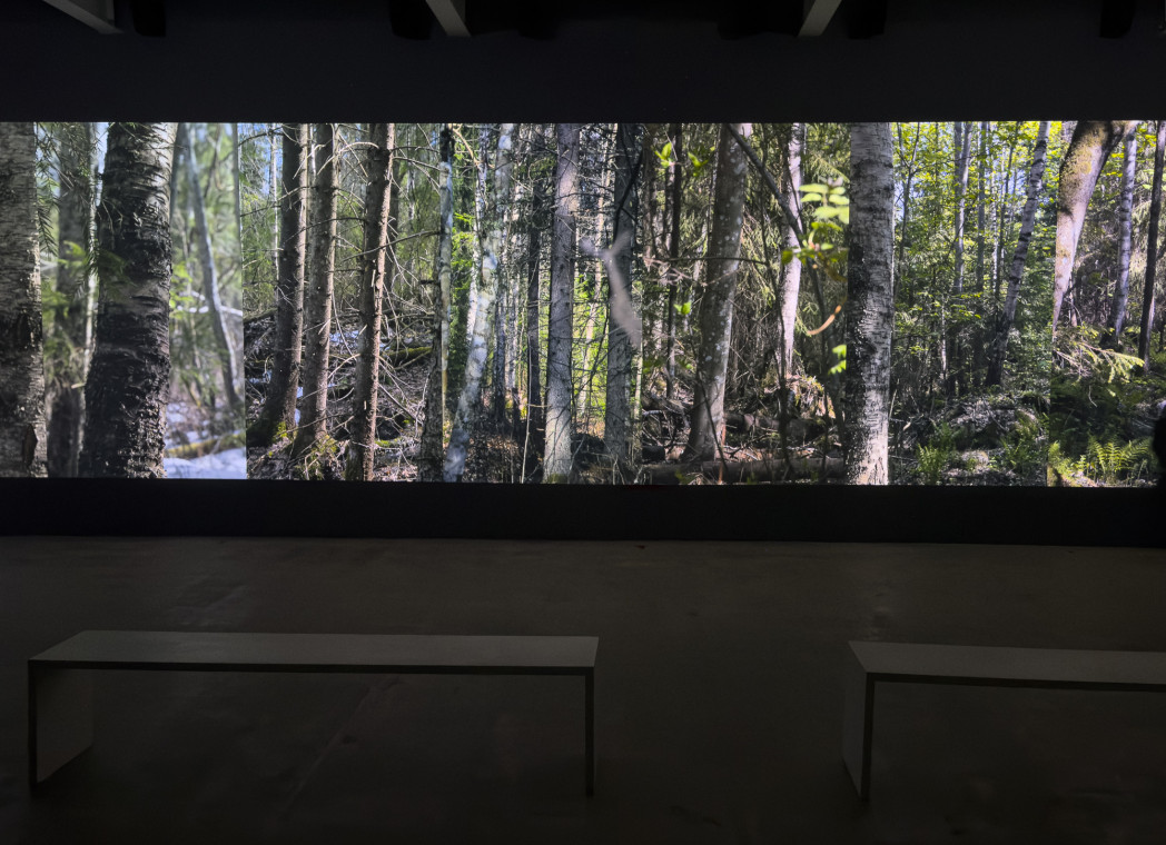 The spatiality of the forest is approached in the installation through eight passages, each of which enters the tract of forest. At the start, the initial images of all passages together constitute a unified landscape. The camera then begins to approach each framed area, breaking the landscape and opening up eight separate passages into the forest.